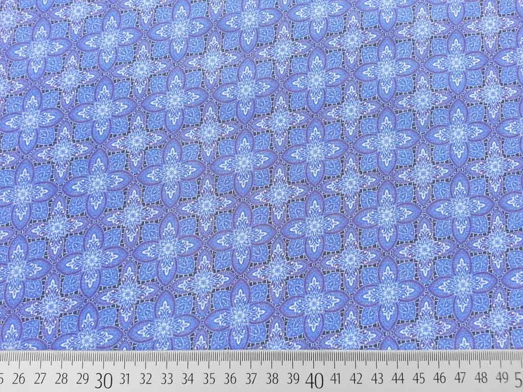 Ein luftig leichter Viskose Stoff mit Blumen und Ornamenten in jeansblau, mittelblau, weiss und schwarz.
