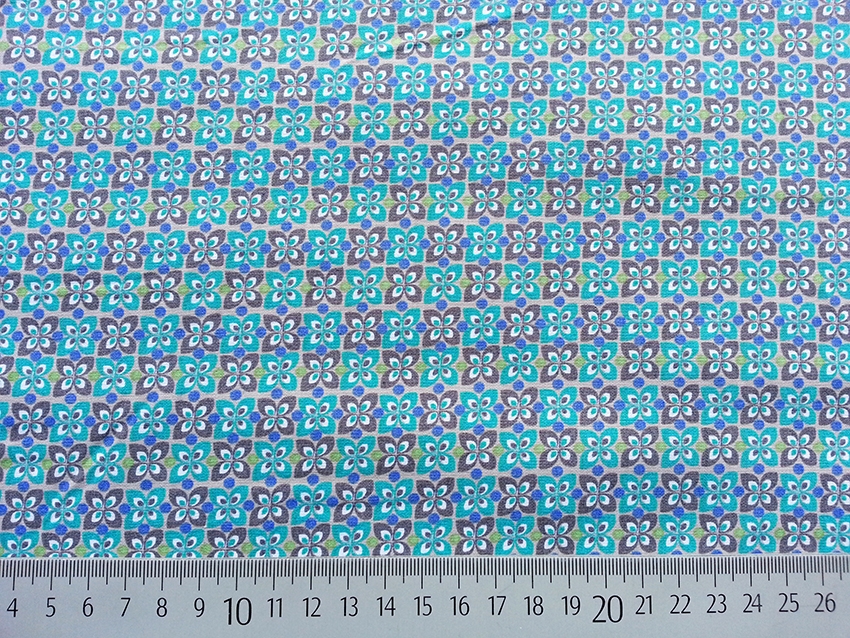 Ein beiger Baumwollstoff mit kleinen Kreuzblumen bestehend aus Blättern in petrol, braun, und weiß sowie blauen Punkten.