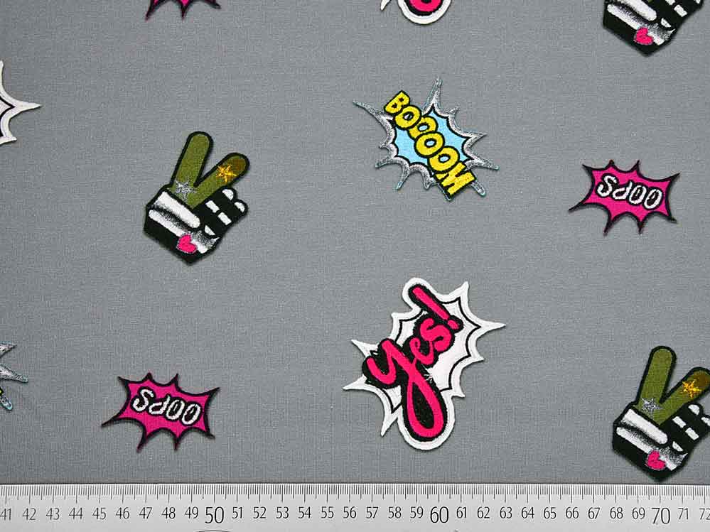 Ein weicher Baumwolljersey als Digitaldruck in grau mit bunten Patches z.B. Boom, Yes, etc.