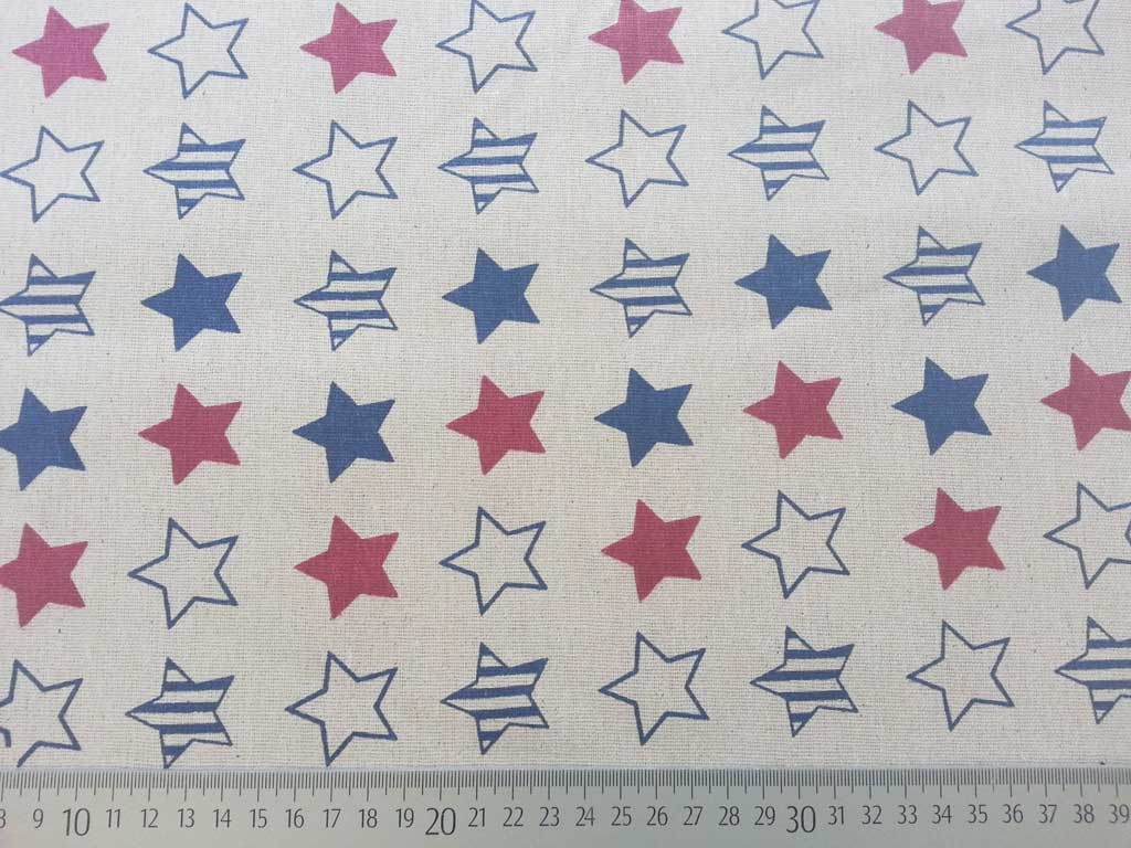 Ein etwas dickerer und festerer Stoff (Dekostoff) in natur mit roten und blauen Sternen. So einfach und doch so cool!