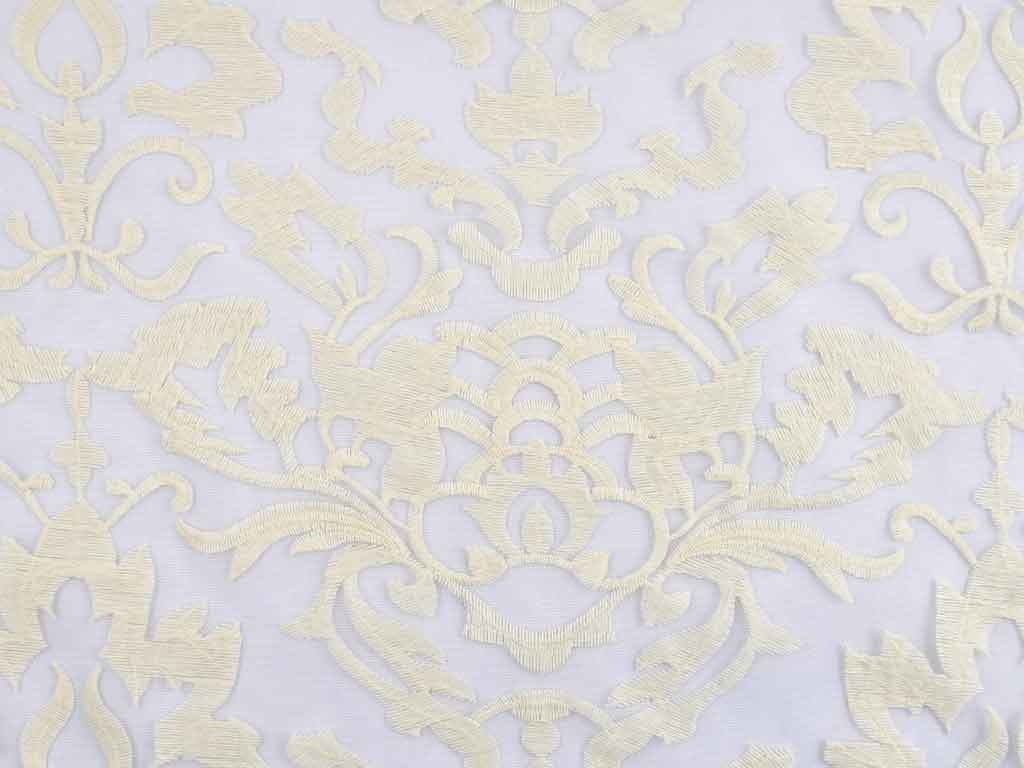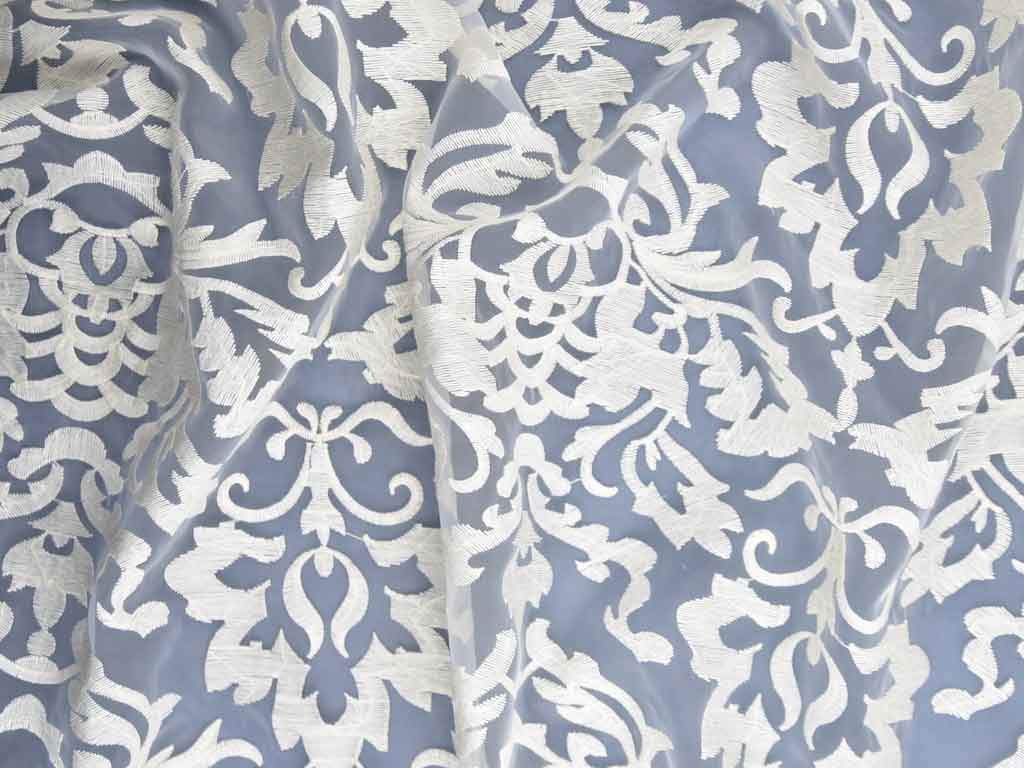 Ein transparenter Organzastoff bestickt mit Ornamenten aus cremeweißem Baumwollgarn.