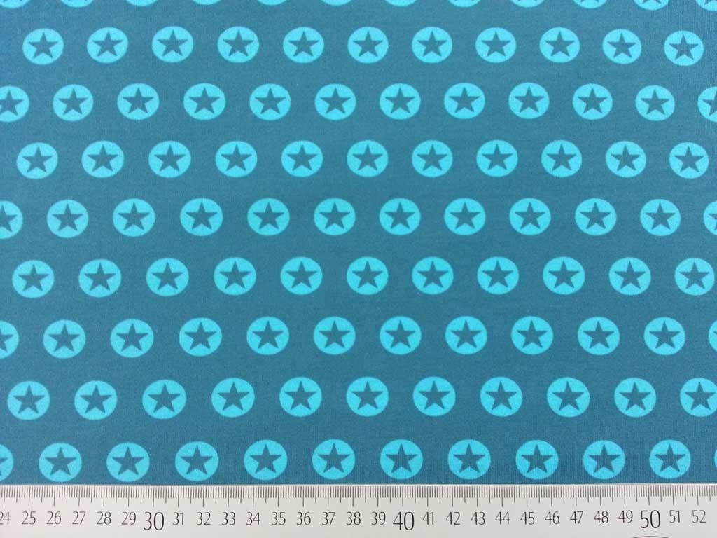 Ein weicher Jersey in petrol mit aquamarin-farbenen Kreisen und petrol-farbenen Sternen. Die Kreise sind 1,7 cm im Durchmesser.