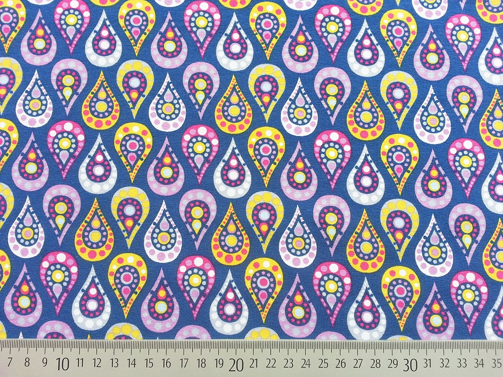 Ein wunderschöner Jersey aus der Serie Paisley & Stars mit bunten Paisleys in rosa, gelb, flieder pink und weiß auf blau.