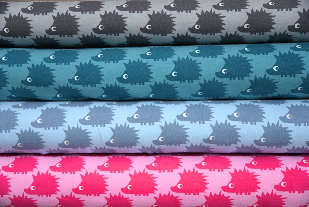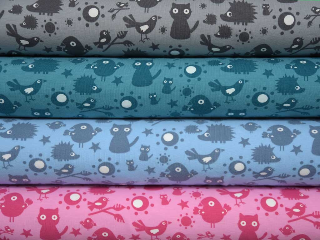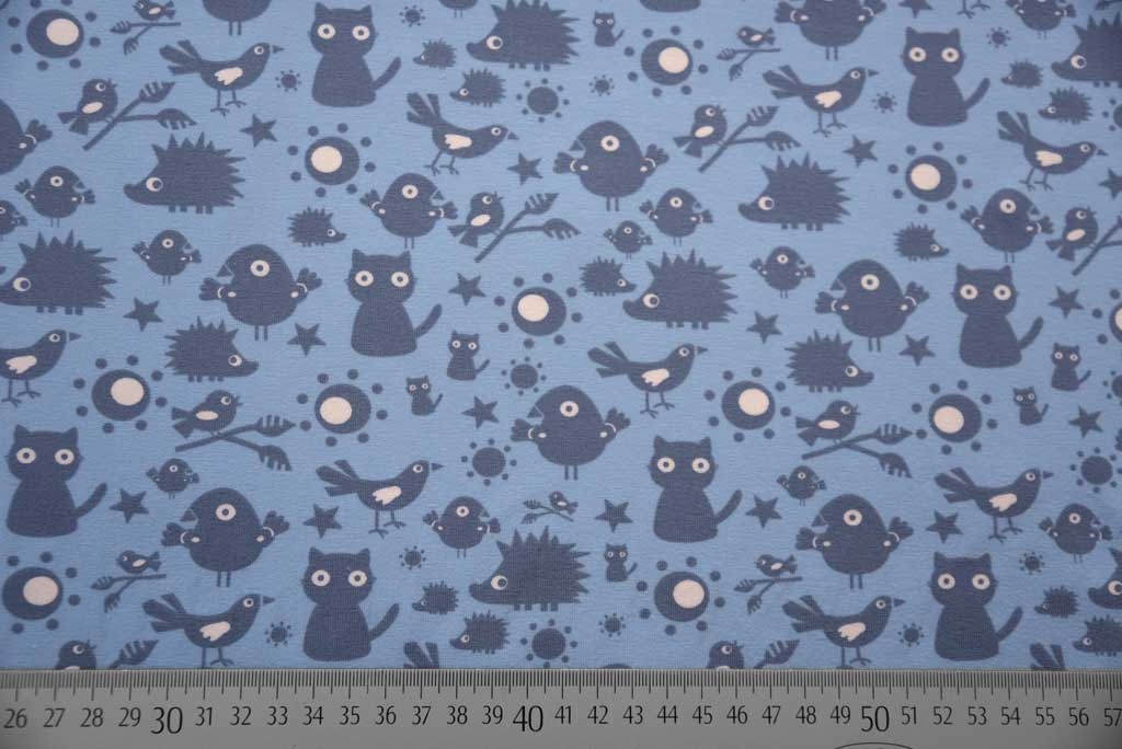 Ein weicher, hellblauer Baumwolljersey von Bienvenido Colorido aus der Kollektion See You mit rauchblauen Tieren wie Igeln, Katzen und Vögeln. Dieser Stoff wird in dem Buch "Baby Leicht - Nähen mit Jersey" von Klimperklein verwendet.