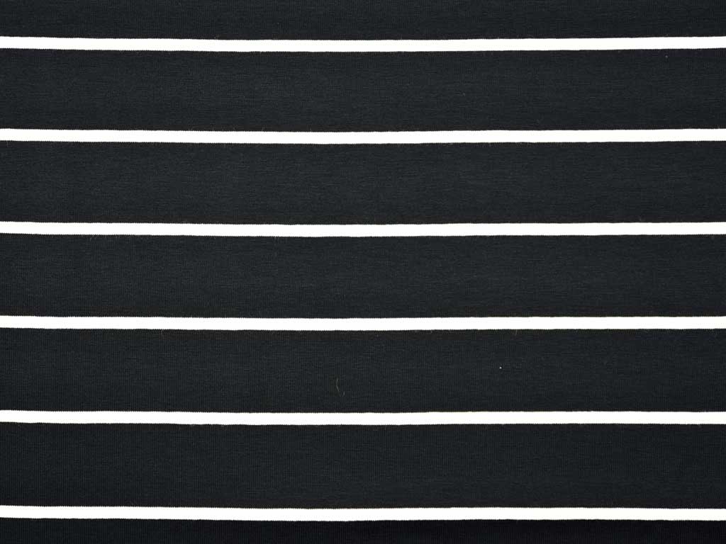 Ein weicher und locker fallender Viskosejersey in schwarz mit weißen Streifen . Die weißen Streifen sind 0,5 cm breit, die schwarzen Streifen 4 cm. Aufgrund des Elasthan Anteils dehnt sich der Stoff leicht und bietet hohen Tragekomfort.