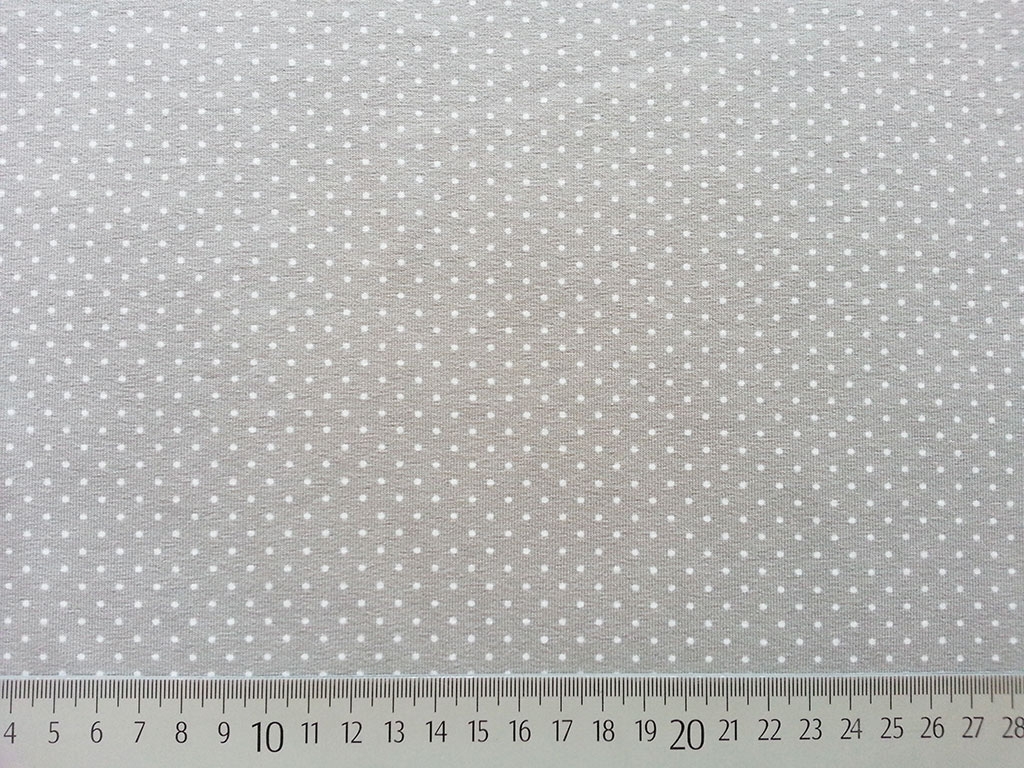 Ein weicher Jersey in taupe mit 2 mm großen weißen Punkten.