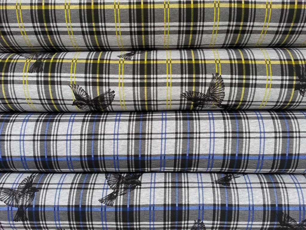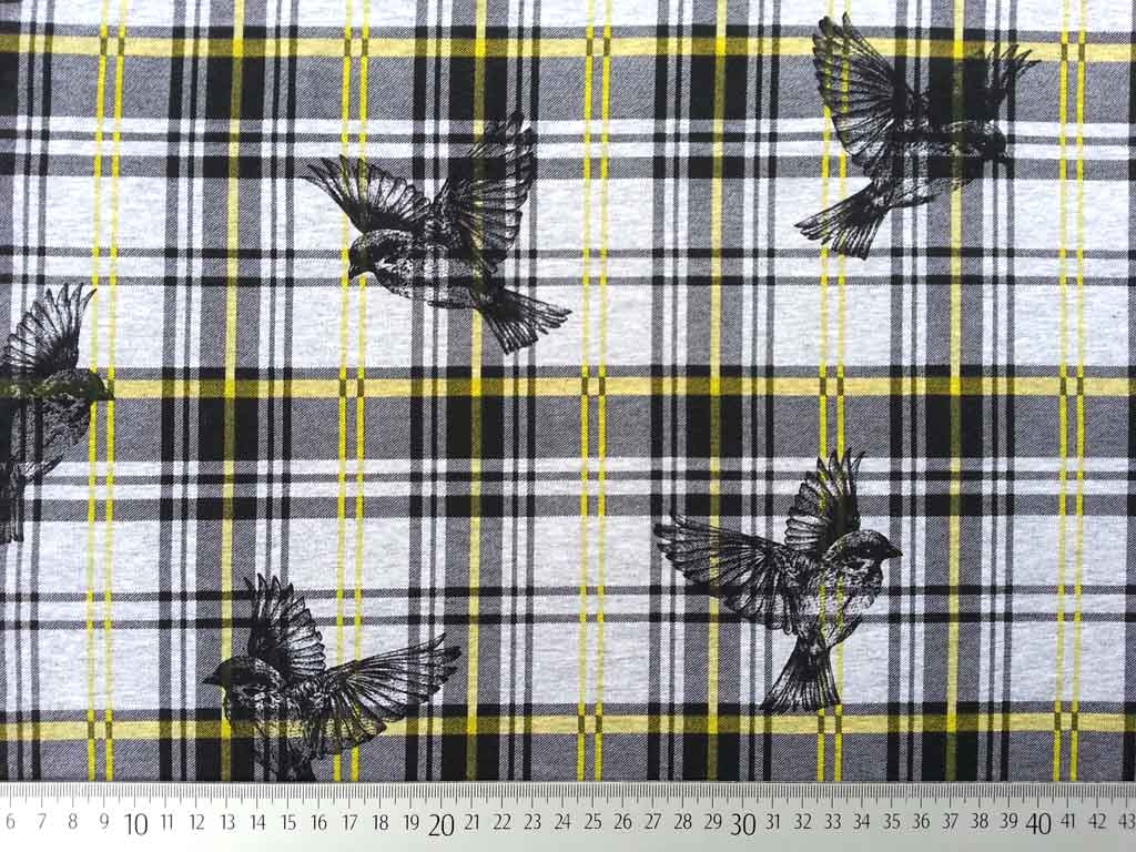 Ein grau melierter Sweatstoff mit gelb-schwarzem Schottenkaro sowie Vögeln. Die Rückseite ist angeraut und kuschelig weich.
