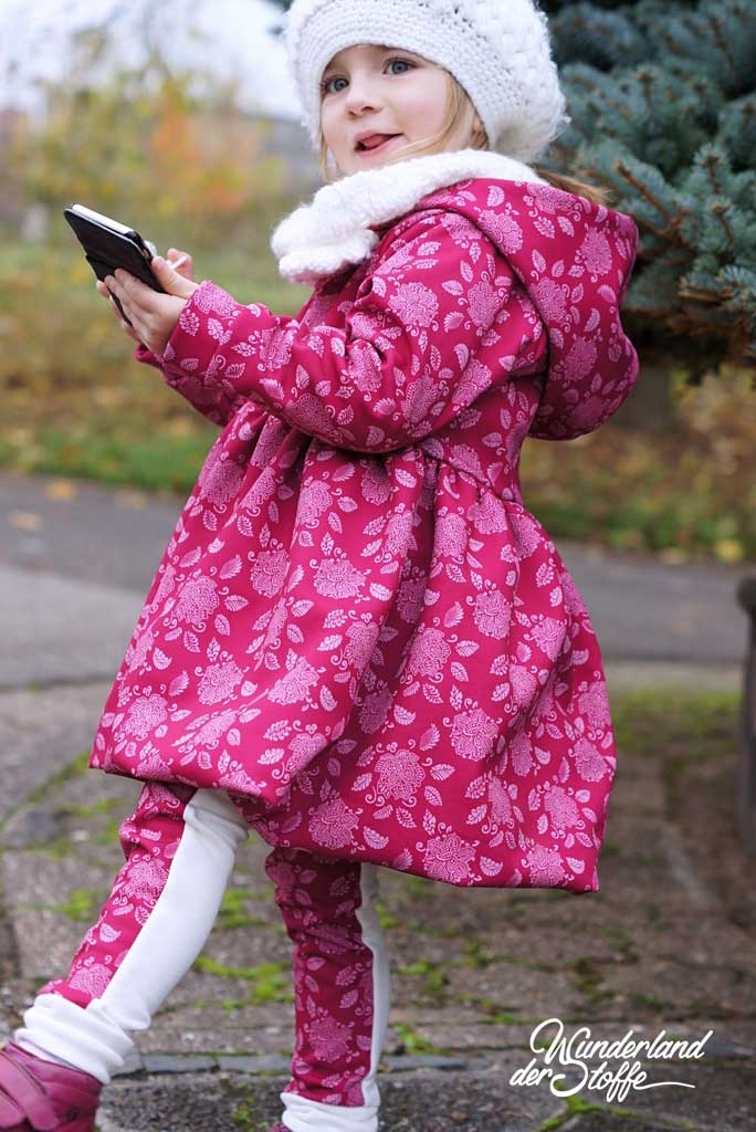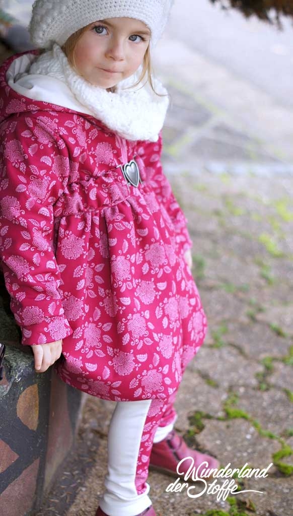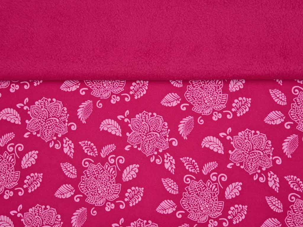 Ein hochwertiger, weicher Softshell mit 3 Schichten hier in Himbeerpink mit hellrosa Blüten und Blättern. Die Rückseite ist aus Himbeerpinkem Fleece. Aufgrund des Elasthan Anteils dehnt sich der Stoff und bietet hohen Tragekomfort.