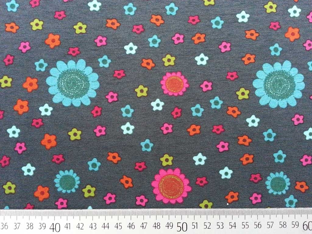 Ein weicher, dunkelgrauer Baumwolljersey von Stenzo mit bunten Blumen in verschiedenen Größen.