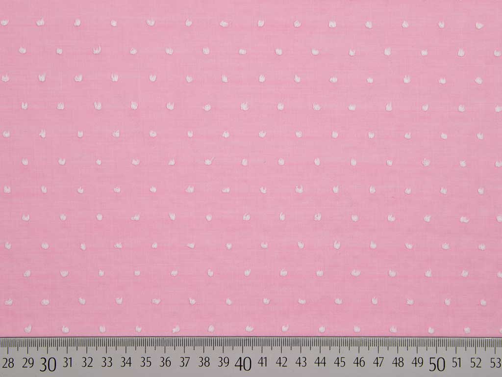 Ein leichter Baumwollbatist in rosa meliert mit weißen Punkten. Die weißen Punkte sitzen auf dem Stoff und wurden durch abgeschnittenen Fäden erzeugt.
