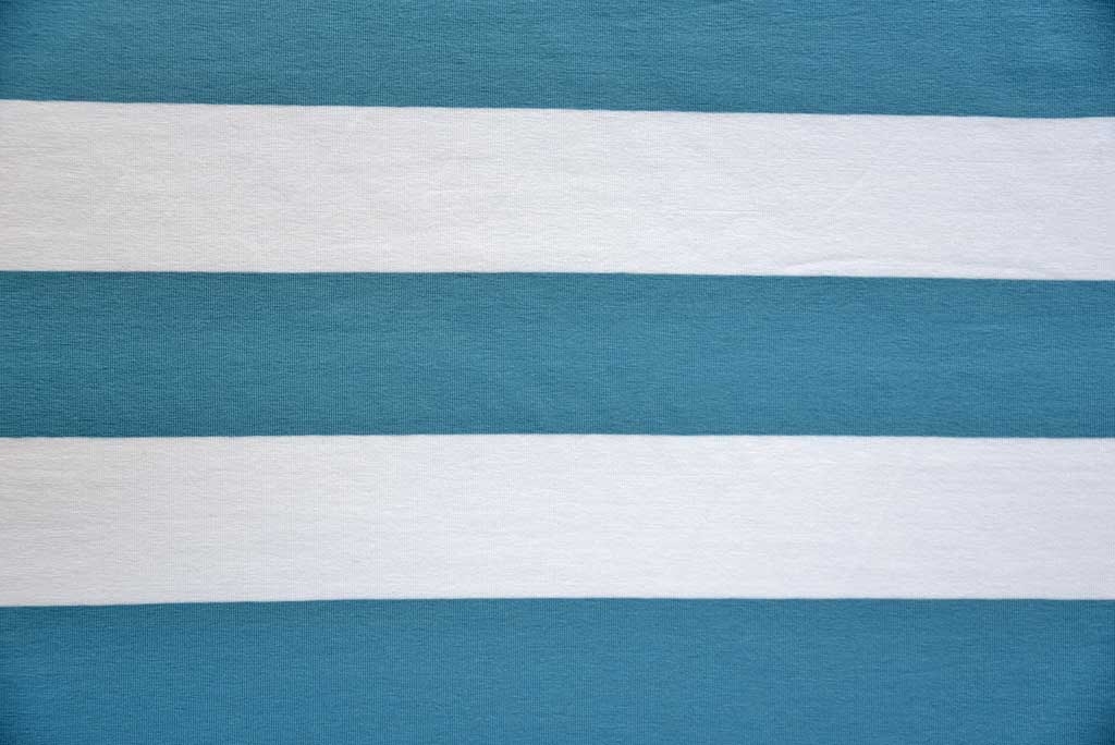 Ein wunderschöner Baumwolljersey in weiß mit eisblauen Blockstreifen. Die Streifen sind 6 cm breit.