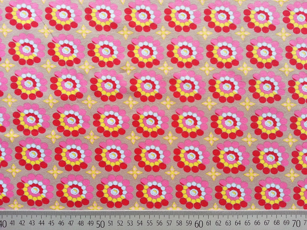 Ein toller Jersey in beige mit rot, rosa, gelben und hellblauen Retroblumen und rosa Kreuzen.