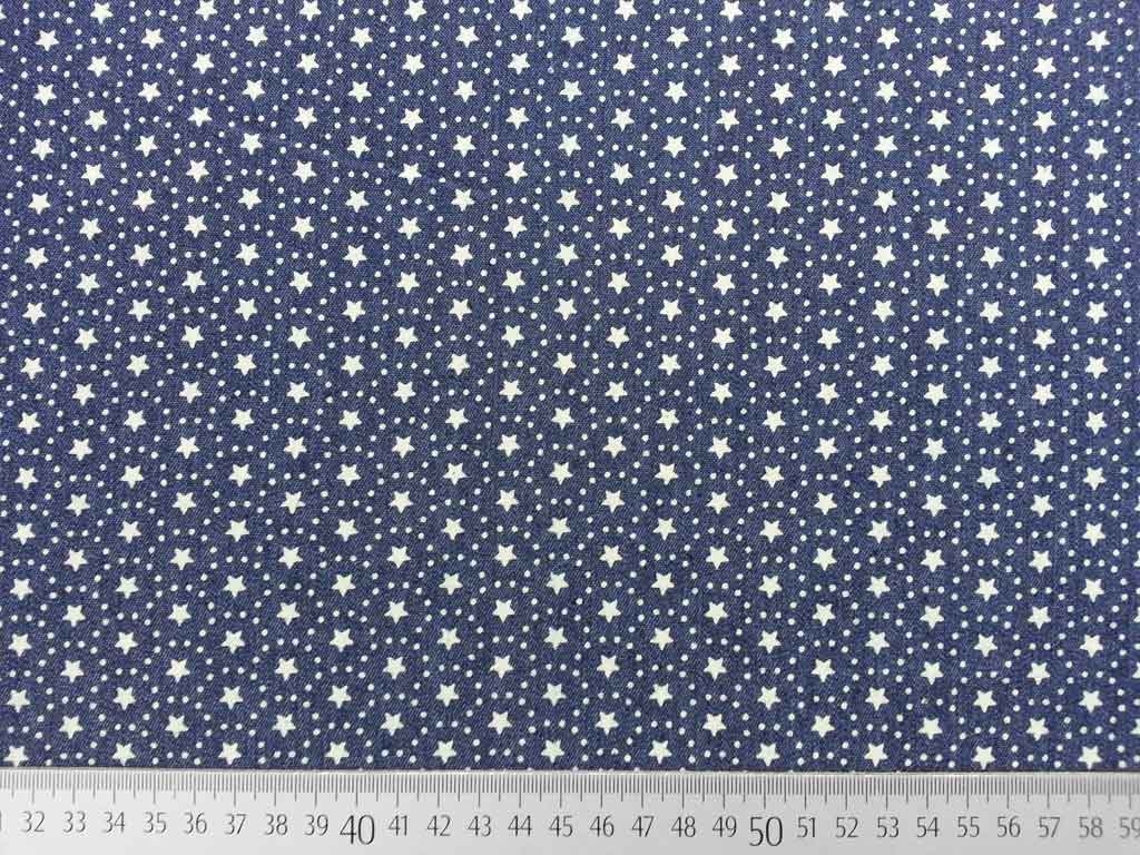 Ein weicher und elastischer Stretch Denim in dunkelblau mit weißen Sternen und Punkten, die als Kreis um den Stern angeordnet sind.