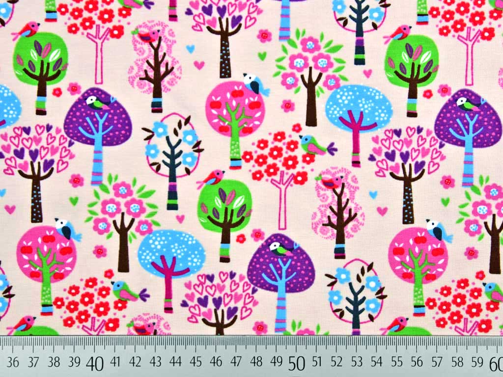 Ein weicher Jersey aus Bio-Baumwolle in hellbeige mit gemusterten Bäumen mit kleinen Äpfelchen, Blümchen, Herzchen und Pünktchen.