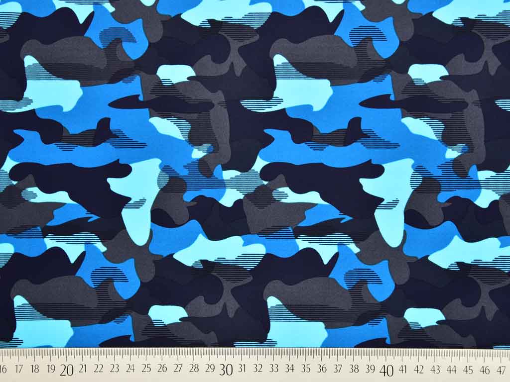 Ein schnelltrocknender, elastischer Badeanzugstoff in Camouflageoptik in blau, türkis, schwarz. Neben Bademode eignet sich der Stoff auch perfekt für Sport- und Freizeitkleidung. Wir empfehlen bei der Weiterverarbeitung eine Stretchnadel zu verwenden.