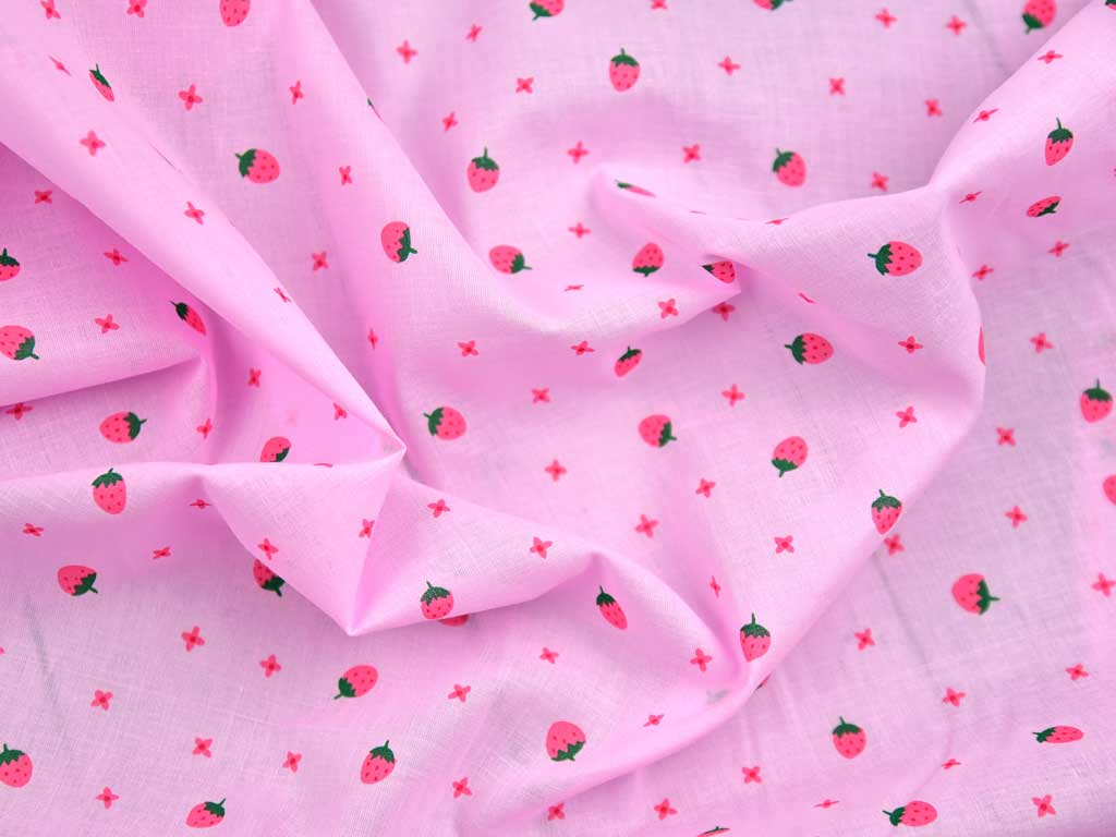 Ein weicher rosa Voile aus 100% Baumwolle mit grün-pinken Erdbeeren. Wie bei Voile üblich, handelt es um einen leichten, feinfädigen und leicht transparenten Baumwollstoff.