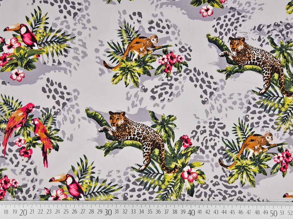 Ein edler elastischer Baumwollsatin mit modischem Leoparden und Blumendruck in creme mit hellgrau.