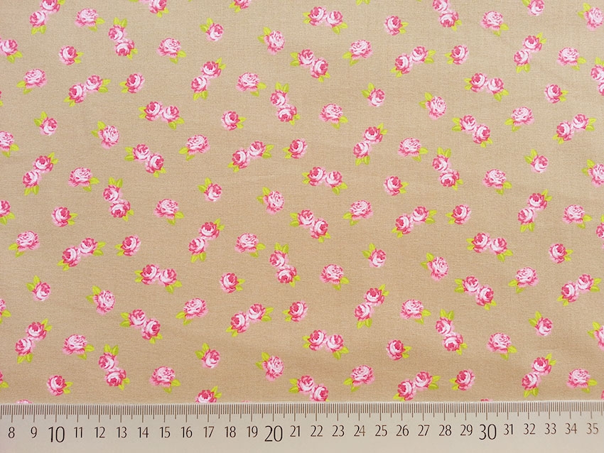 Ein weicher und sehr glatter Baumwollstoff in beige mit kleinen rot-pinken Rosen.