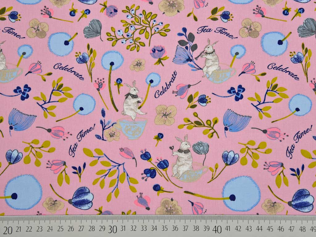 Ein wunderschöner Baumwollstoff in altrosa mit Blumen, Sträuchern und Hasen u.a. in hellblau, jeansblau, dunkelblau, grüngelb.