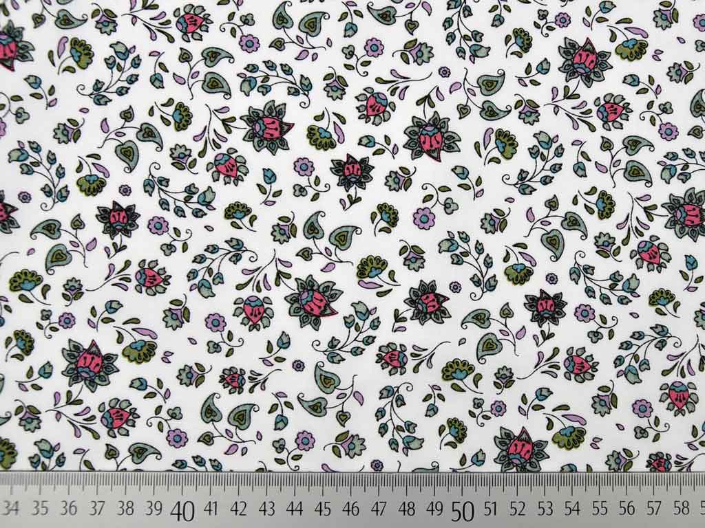 Ein toller Baumwollpopelin in weiß mit Blümchen und Paisley Muster in mint, hellblau und rosa.