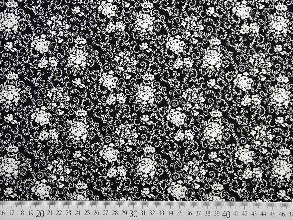 Ein wunderschöner, schwarzer Baumwollstoff mit cremeweißen Blumen und Ranken.