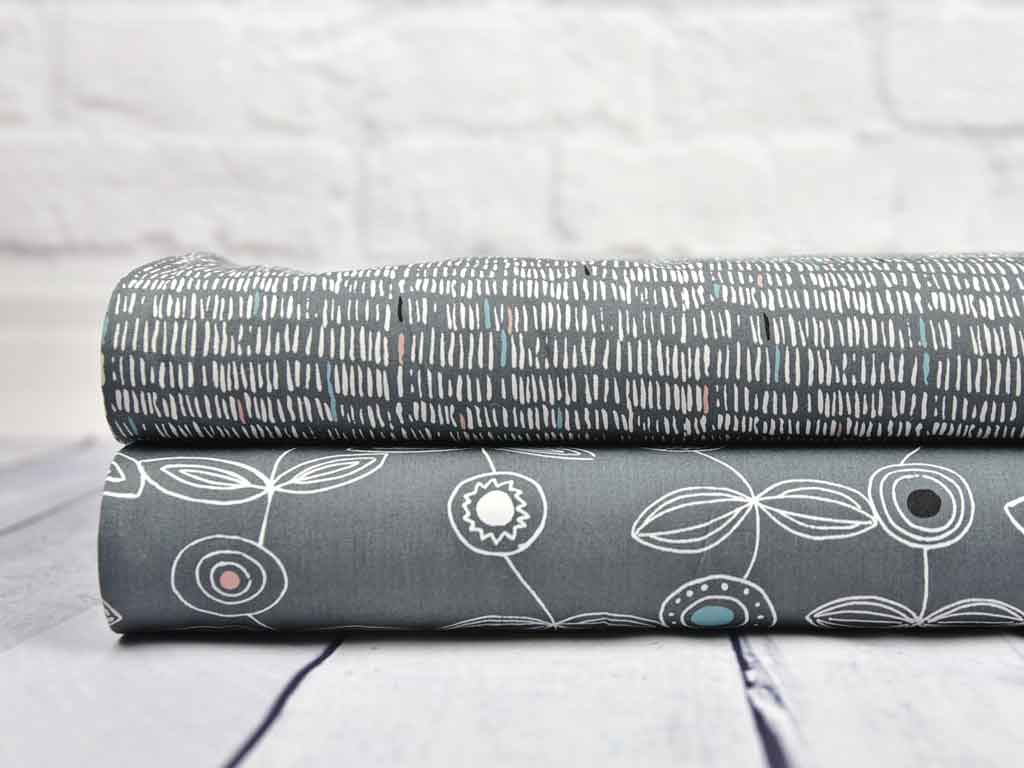 Ein weicher Baumwollstoff in dunkelgrau mit weißen Blumen und Stengeln im Doodle Stil und Farbakzenten in schwarz, altrosa und jeansblau.