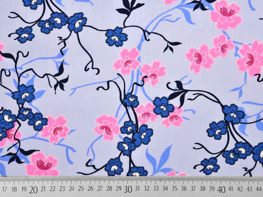 Ein schöner Baumwollstoff in hellblau mit rosa-pinken und mittelblauen Blumen und Ranken.