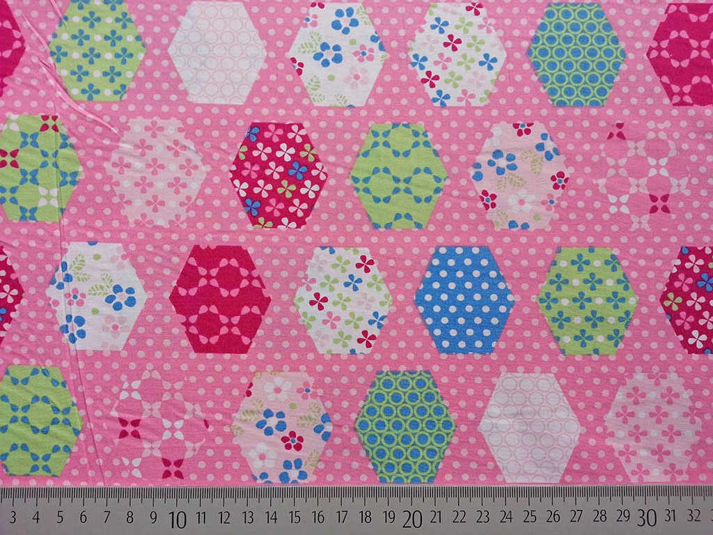 Ein wunderschöner, hellrosa gepunkteter Baumwollstoff mit Sechseck-Muster im Patchwork Stil.