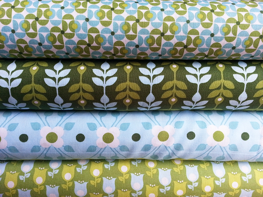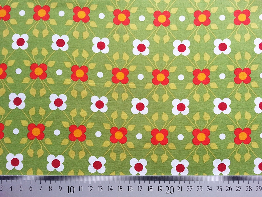 Ein weicher und sehr glatter Baumwollstoff in grün mit Blumenmuster und Punkten in orange, weiß und rot.