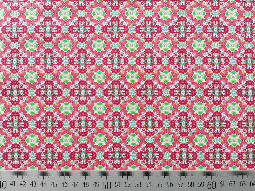 Ein weicher und glatter Baumwollstoff aus der Serie A Spark of Happiness in dunkelrot mit grünen und türkisen Blumen.