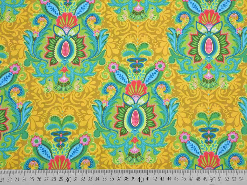 Ein wunderschöner Baumwollstoff aus der Kollektion A Spark of Happiness hier mit opulentem Tapetenmuster in senfgelb mit ocker, grün, rot, roa, türkis und verschiendenen Grüntönen.