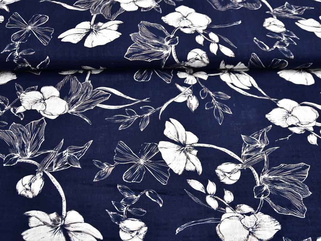 Ein dunkelblauer Baumwoll-Viskosestoff mit weißen Blumenblättern. Der Stoff ist mit unterschiedlich dicken Fäden gewebt worden und bekommt somit eine leichte Gitteroptik. Der Stoff ist luftig leicht und hat einen weichen Fall.