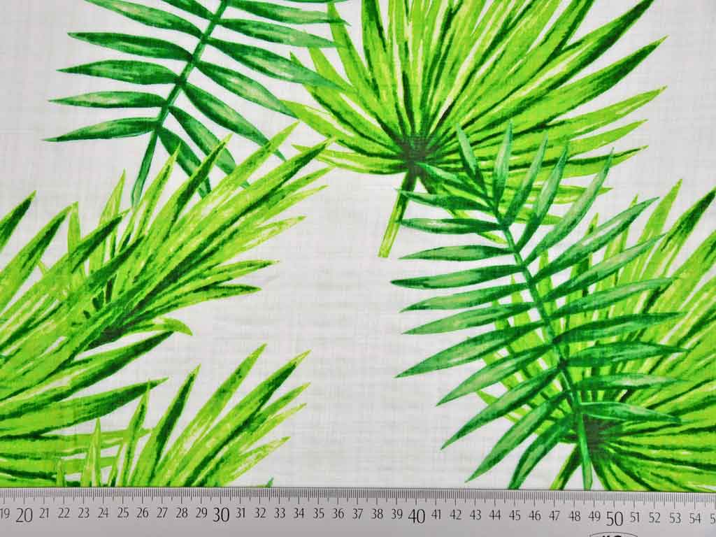 Ein weißer Baumwoll-Viskosestoff mit grünen Palmblättern. Der Stoff ist mit unterschiedlich dicken Fäden gewebt worden und bekommt somit eine leichte Gitteroptik. Der Stoff ist luftig leicht und hat einen weichen Fall.