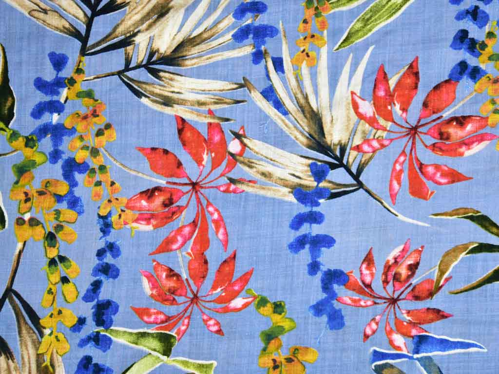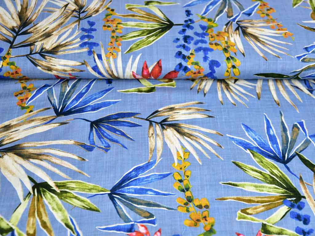 Ein blauer Baumwoll-Viskosestoff mit tropischen Blättern in dunklerem Blau, Ocker und Rot. Der Stoff ist mit unterschiedlich dicken Fäden gewebt worden und bekommt somit eine leichte Gitteroptik. Der Stoff ist luftig leicht und hat einen weichen Fall.