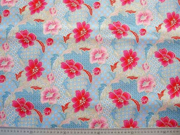 Ein Baumwollstoff mit tollen Blumen in pink und rosa auf türkis. Weitere Farben im Stoff sind versch. Blautöne und Beige.