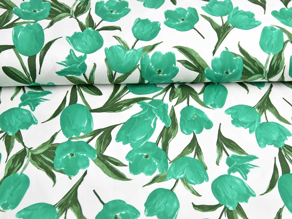 Ein elastischer, weißer Baumwollsatin mit glatter Oberfläche und großen grünen Tulpen.