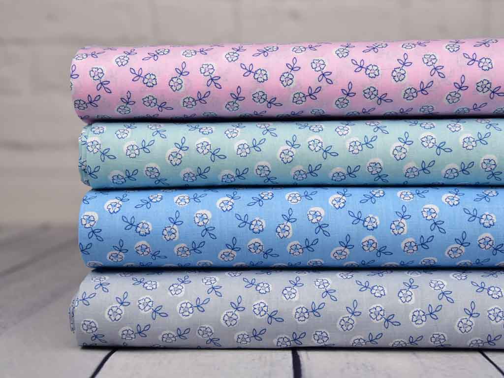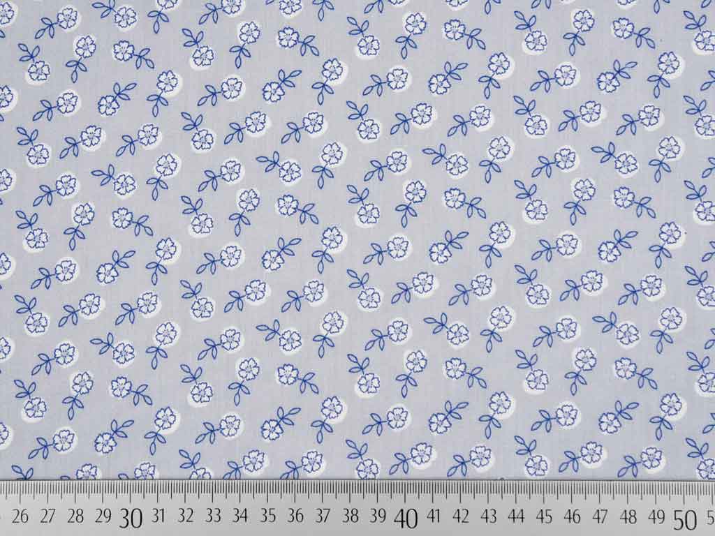 Ein hellgrauer Baumwollstoff (Popelin) mit zarten Blümchen in dunkelblau und weiß.