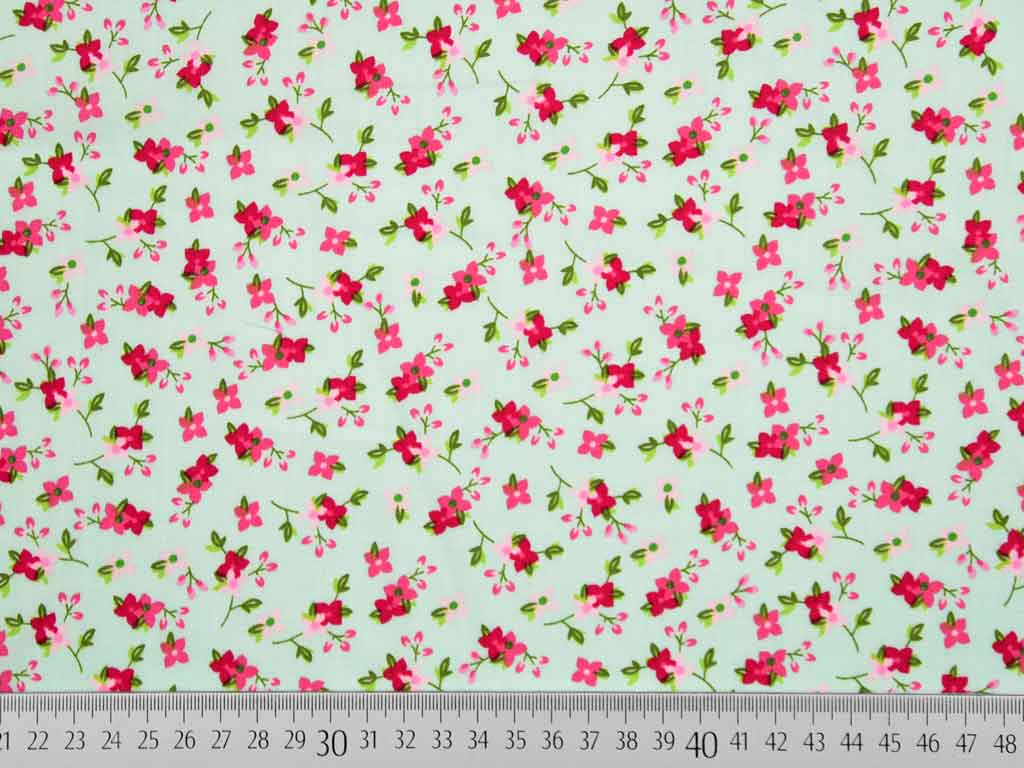 Ein mintgrüner Baumwollstoff (Popelin) mit kleinen pinken, roten und weißen Blümchen sowie grünen Blättern und Zweigen.