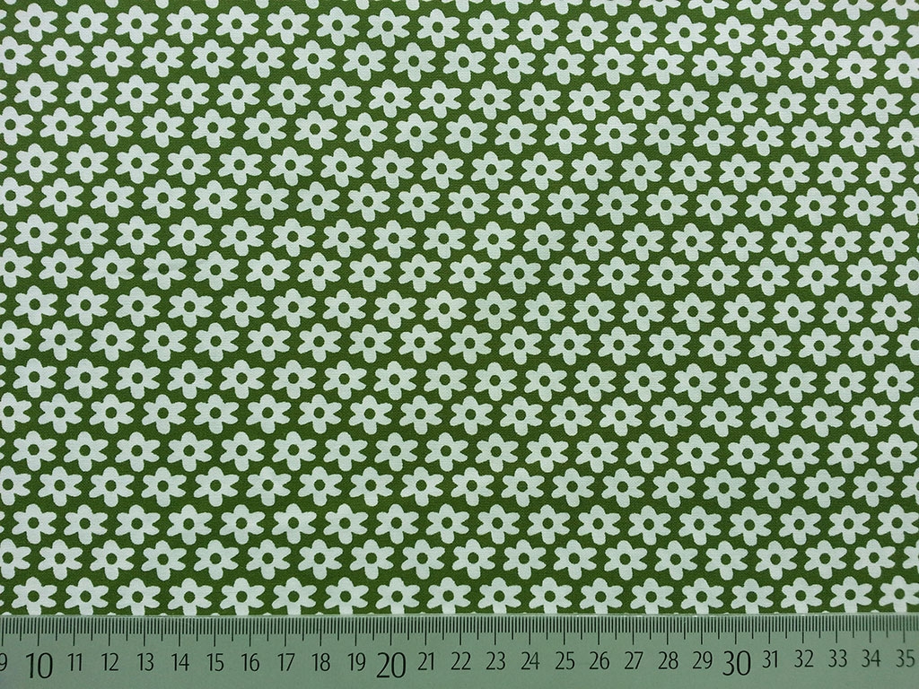 Ein wunderschöner Baumwollpopelin mit weißen Blümchen auf oliv (grün).