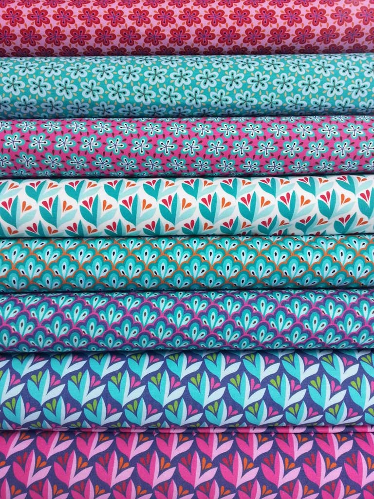 Ein rosa Baumwollpopelin (Sea of Blossoms) von der Hamburger Liebe aus der Serie Eden mit kleinen, fünfblättrigen Blumen in rot, pink, orange, blau und dunkellila.