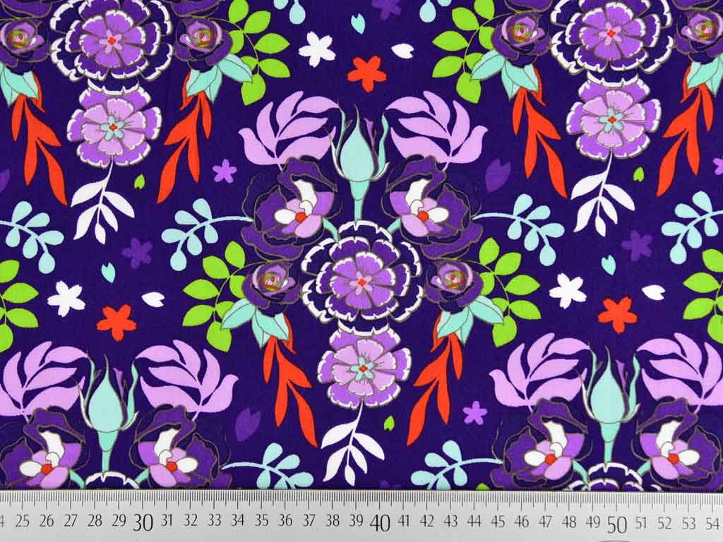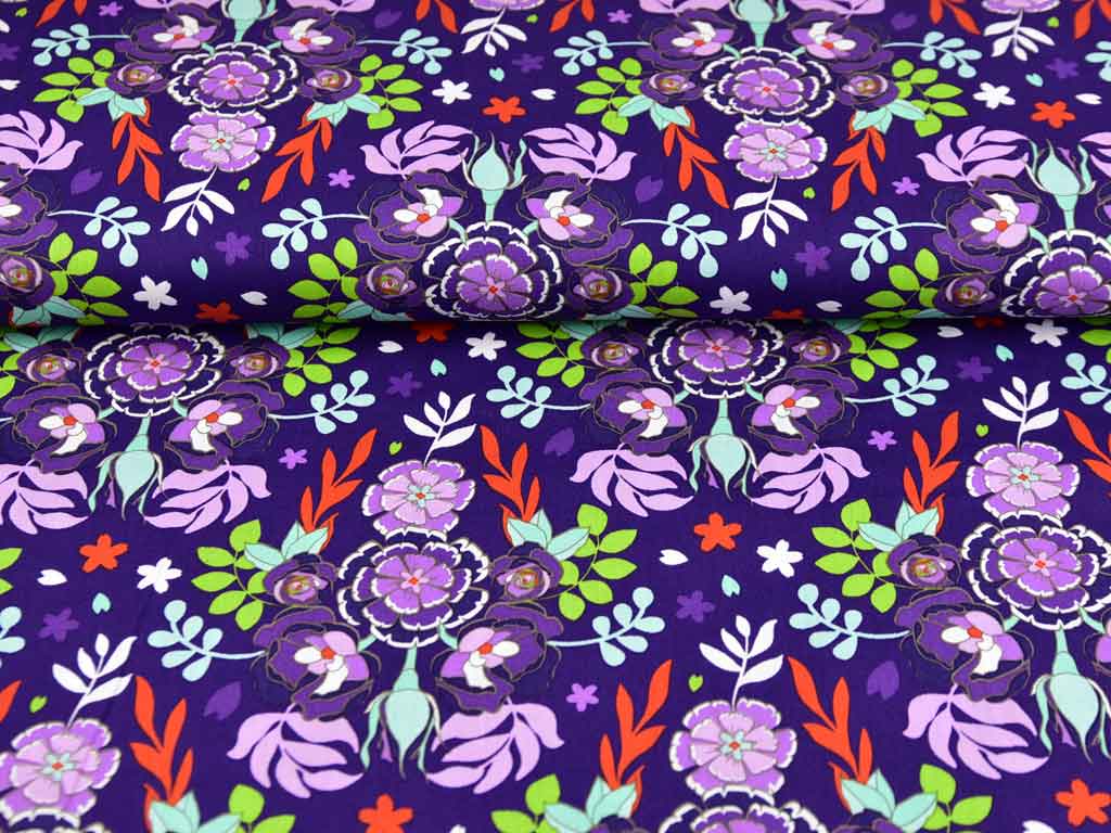 Ein leichter Baumwollstoff (Popeline) in Farbe Lila mit bunten Blumen und Rosenknospen in Mint, Flieder, Gün, Weiß und Orange.
