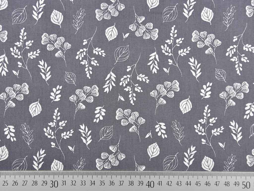 Ein mausgrauer Baumwollstoff (Popeline) mit weissen Blättern, Blumen und Zweigen. Die Blumen und Blätter messen ca. 2,0 cm und die Zweige ca. 4,0 cm.