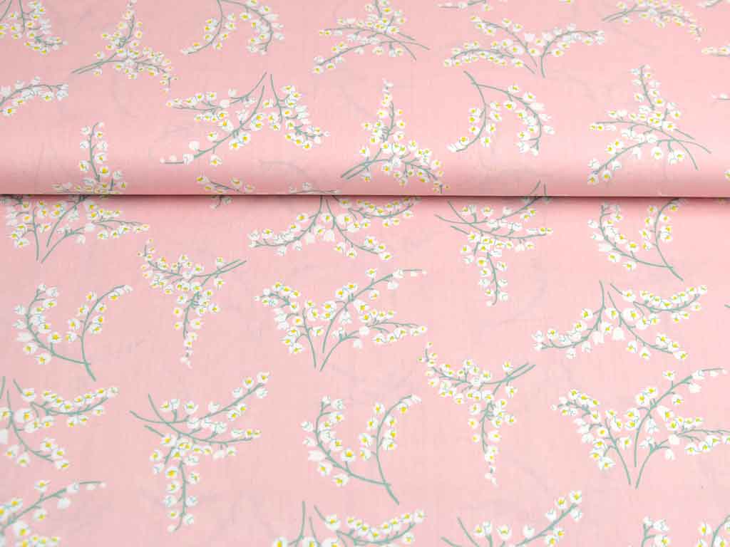 Ein rosa Baumwollstoff (Popelin) mit weißen Maiglöckchen, die einen gelben Blütenstempel haben.