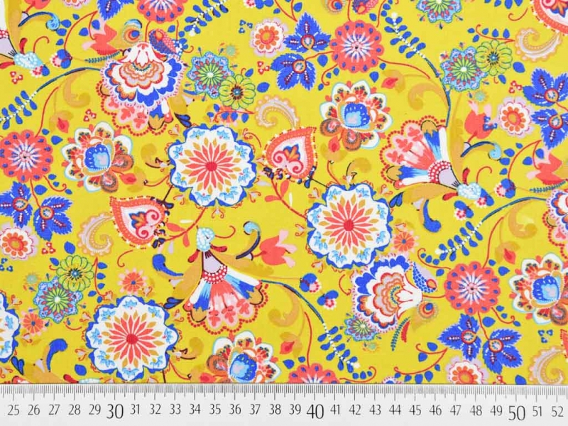 Ein farbenfroher Baumwollstoff (Popelin) in hellem Senfgelb mit bunten Blumen, Paisley, Ranken und Blättern.