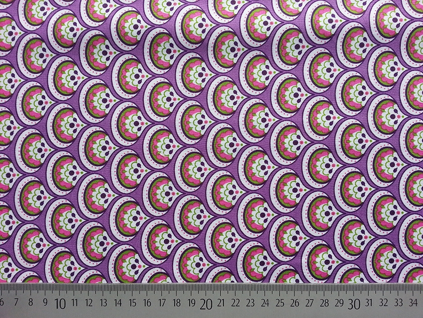Ein wunderschöner Baumwollstoff von Tante Ema mit Tropfen in flieder mit weiß, rosa und hellgrün.