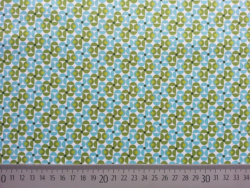 Ein weißer Baumwollstoff mit hellblauen und hellgrünen Halbkreisen angeordnet zum grafischen Muster. Der Stoff ist weich und hat eine glatte Oberfläche.