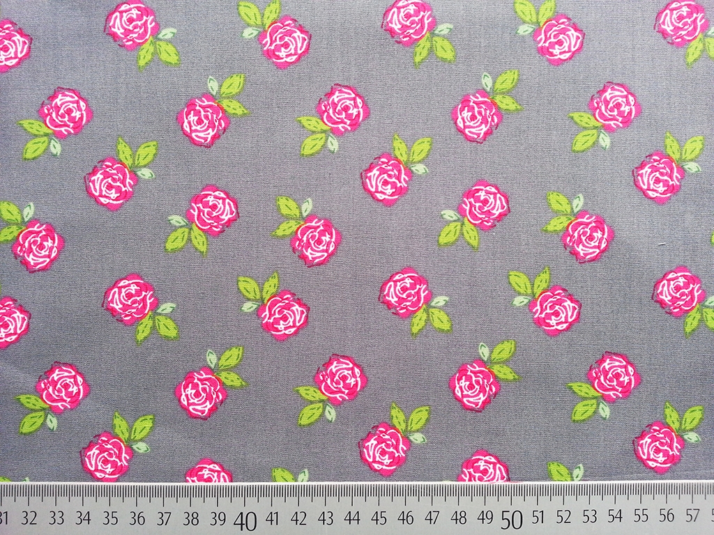 Ein dunkelgrauer Baumwollstoff mit pinken Rosen und hellgrünen Blättern. Einfach total romantisch!