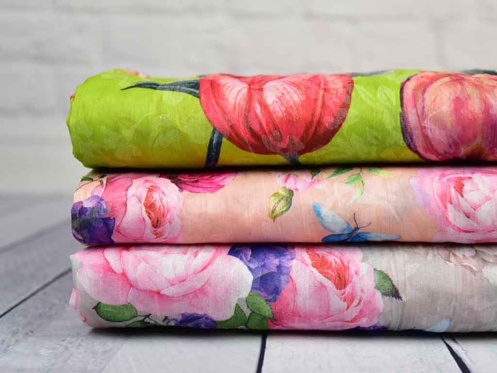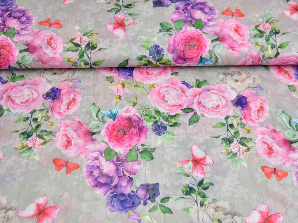 Ein leichter, grauer Blusenstoff mit romantischen rosa, lilafarbenen und beigen Rosen, die von grünen Zweigen und Knospen umgeben sind. Blaue und rote Schmetterlinge umgeben die Blumen. Der Stoff hat sowohl einen Crinkle-Effekt als auch eine Ausbrenner-Optik, die durch den Druck erzielt wird. Der Stoff ist luftig leicht und hat einen weichen Fall.