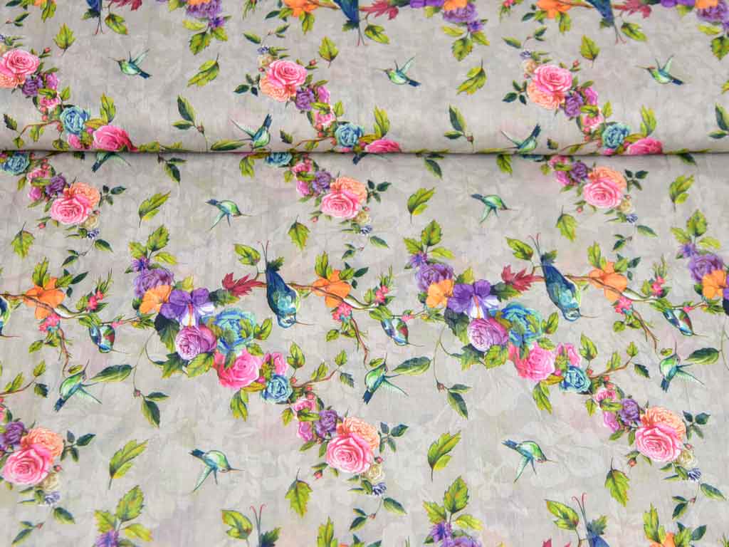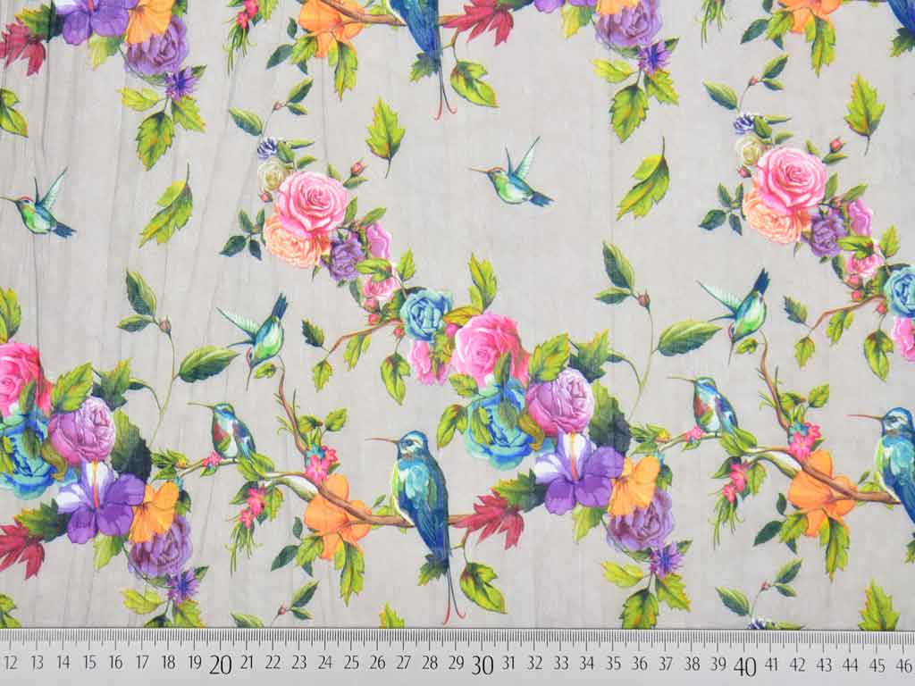 Ein leichter, grauer Blusenstoff mit kleinen Kolibris sowie Hibiskus- und Rosenzweigen. Die Blumen sind in den unterschiedlichsten Rot- und Pinktönen sowie einem leuchtenden Orange gehalten. Der Stoff hat sowohl einen Crinkle-Effekt als auch eine Ausbrenner-Optik, die durch den Druck erzielt wird. Der Stoff ist luftig leicht und hat einen weichen Fall.