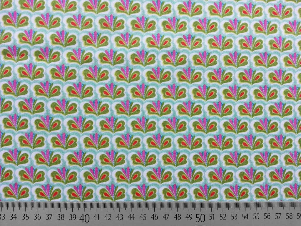 Ein wunderschöner Baumwollstoff mit Fächermuster in khaki und pflaume.